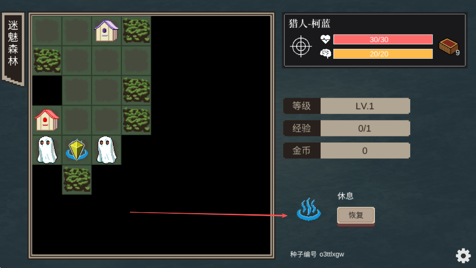 1、进入游戏,查看右侧角色猎人-柯蓝的生命值30/30、精神值20/20、等级LV.1等信息。