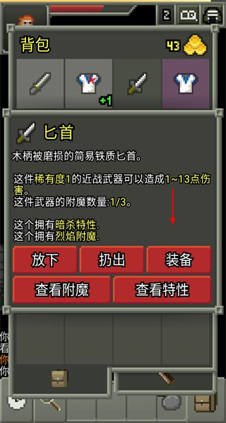 2、在背包界面管理物品,饭团可食用恢复状态,武器可装备提升战力,还可查看物品的附魔、特性等属性。