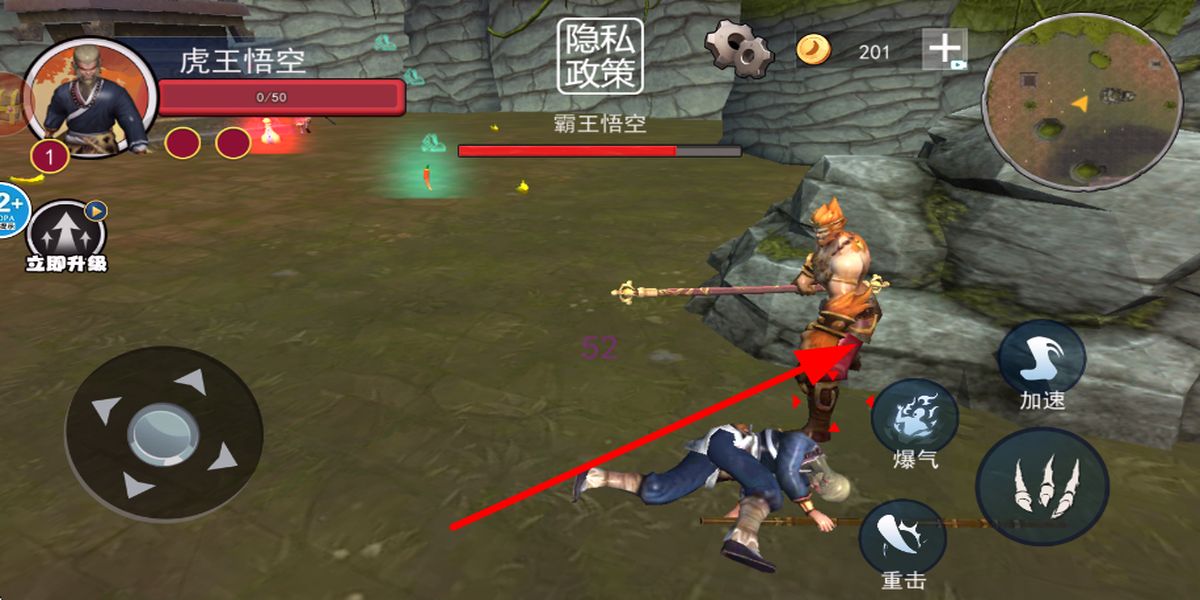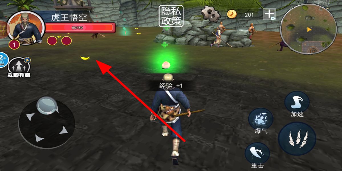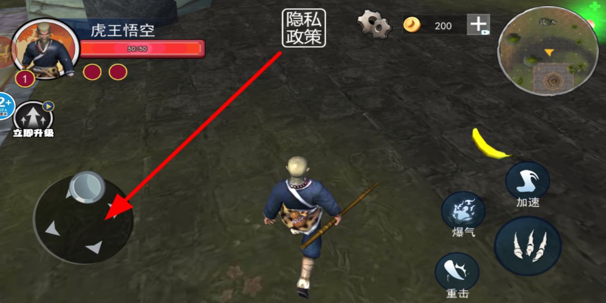 1、首先通过操作按钮操控角色在场景中移动,调整角色的位置与行动方向,探索西游冒险场景,为后续拾取物品与战斗做准备。