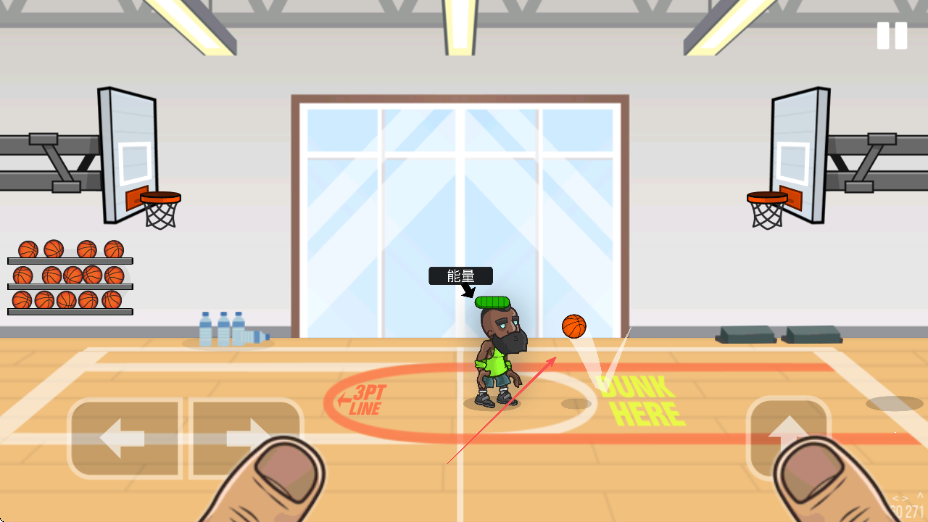 1、通过屏幕下方左右方向键控制角色移动,靠近篮球使其悬浮在身边获取篮球。