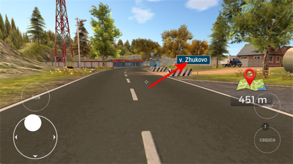 1、在游戏中,关注道路旁的地名标识,结合地图距离提示451m,明确行进方向目标地点,这是关键。