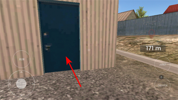 2、操控角色靠近建筑的蓝色大门,大门是进入建筑内部探索或完成任务的入口,靠近后可触发互动操作。