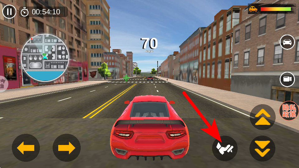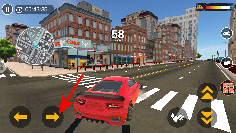 2、游戏中依照箭头指引,点击加速按钮提升车辆速度,朝着任务目标区域前进,注意观察路况避免碰撞。