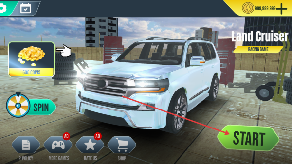 1、进入游戏先熟悉界面里的功能,通过“SPIN”获取500金币,点击绿色START按钮开启游戏。