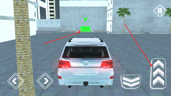 2、使用右侧前进按钮来控制车辆前进,朝着绿色箭头指示的目标区域行驶,时刻留意行驶方向。