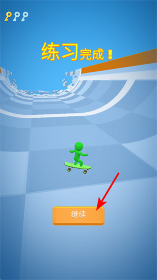4、练习比赛完成后点击继续按钮,这是开启后续竞赛内容的重要操作,点击后会进入新的竞赛流程,持续参与滑板挑战,积累更多奖励与经验。