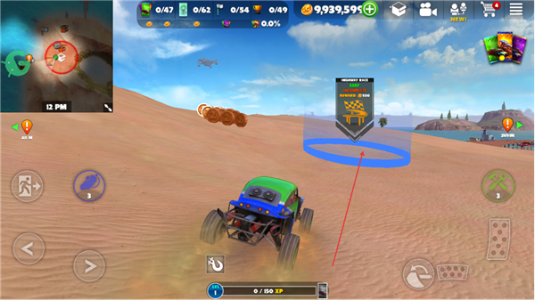 1、操控越野车在沙地行驶,收集沿途道具,向目标区域蓝色圈移动。