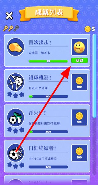 4、完成成就列表中的各项任务,如首次出击等,即可获取足球皮肤等金币奖励,不断提升游戏的趣味性和体验感。