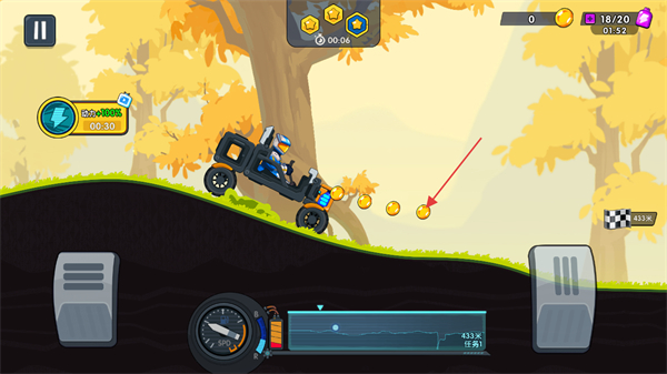3、在保证车辆稳定的同时,可以收集路上的金币和电池。