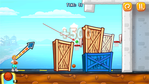 3、在关卡内按照箭头指引调整投篮角度,瞄准木箱旁的篮筐位置,准备投掷篮球以推进当前关卡进程。