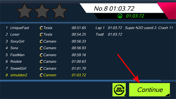 4、比赛结束后,点击continue按钮继续游戏,可进入下一场比赛或查看奖励,持续参与比赛以提升赛车技术。