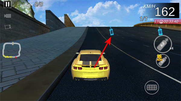 1、在赛车游戏中,操控赛车收集赛道上的蓝色道具瓶,道具瓶可补充氮气或解锁特殊道具,是提升性能优势资源。