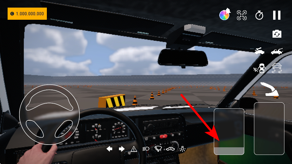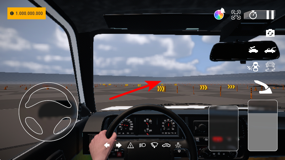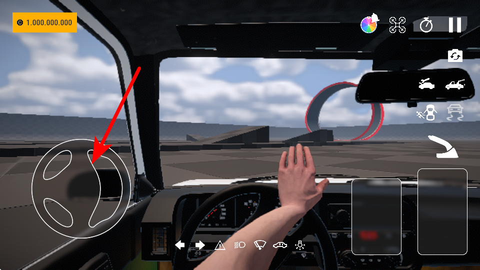 1、在车内驾驶视角下,操作红色箭头指向的方向盘区域,控制车辆转向,调整行驶方向以对准赛道中的环形障碍,为通过特技路段做准备。
