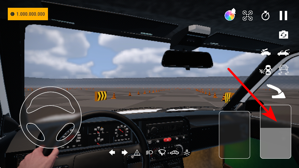 3、遇到弯道时,操作红色箭头指向的刹车按钮,适当降低车辆速度,配合方向盘转向,平稳通过弯道区域,提升驾驶的稳定性。