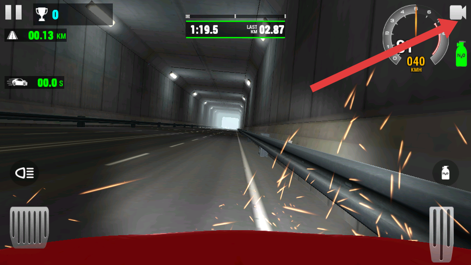 1、先熟悉界面核心信息,关注屏幕中央的速度表,初始阶段保持车速在安全区间,点击右下角油门进行竞速。