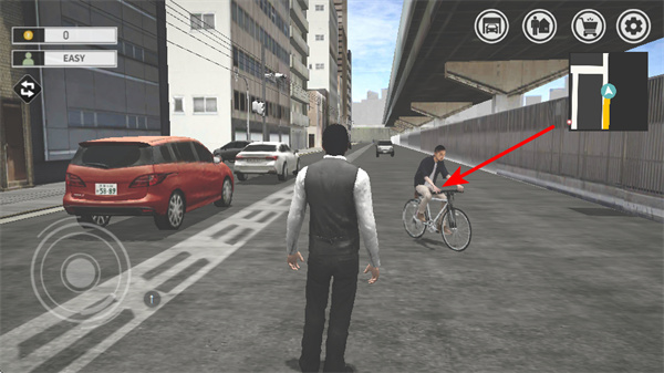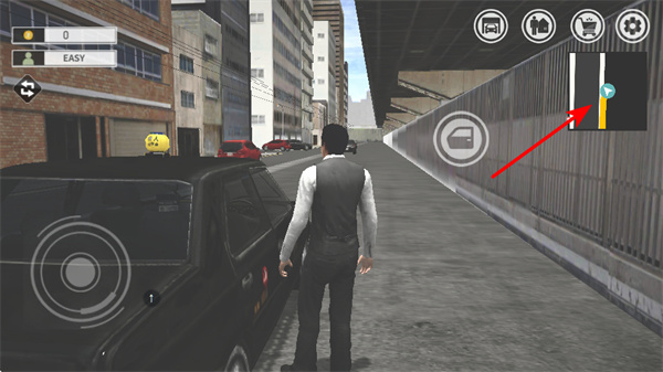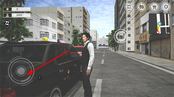 1、掌握移动操作,通过左侧的操控按钮,控制角色在城市街道中移动,靠近出租车或前往任务地点。