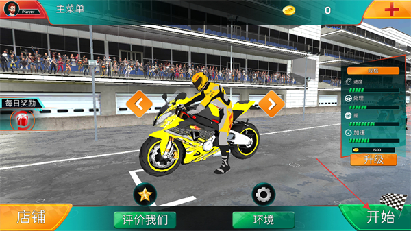 1、打开极速骑行4游戏主页,点击右下角的开始按钮进入比赛模式选择。