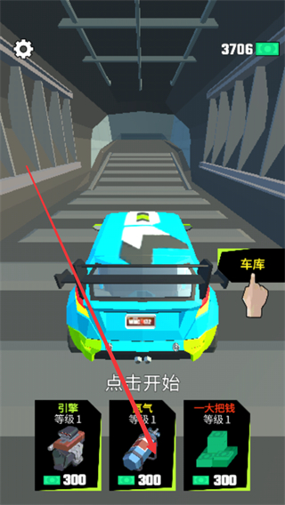 4、进入车库界面、点击开始、可升级引擎等部件、开启疯狂冲刺的新关卡进程。