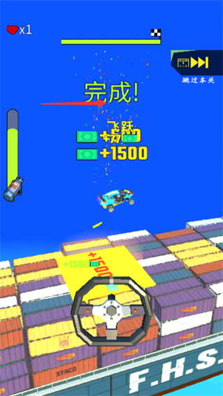 3、关卡结束显示完成、获得飞跃等奖励+1500、结算收益后推进游戏流程。