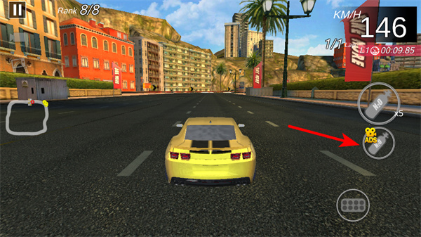 3、在比赛中,合理利用右侧的ADS道具按钮,道具可在关键时刻提升赛车性能或干扰对手,提升比赛排名。