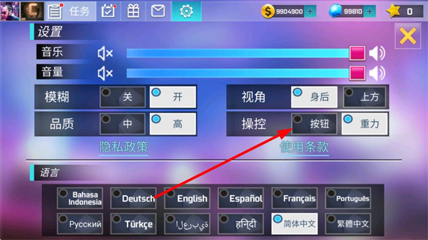 2、将默认的重力模式切换为按钮模式,完成后关闭设置界面,此时车辆操控方式已改为按钮控制。