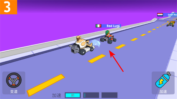 1、超越对手赛车,在赛道上找准时机,操控赛车变道超越其他赛车如Red Luigi的赛车,提升排名。