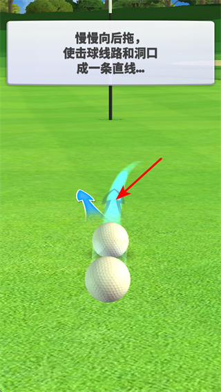 4、调整击球线路,慢慢向后拖,使击球线路和洞口成一条直线,提升将球打入洞成功率。