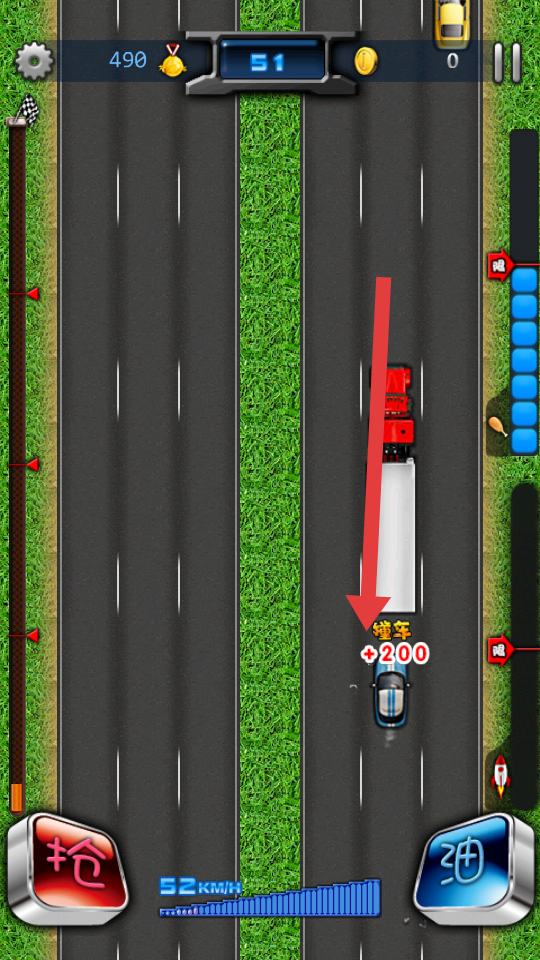 2、轿车阻挡路线时,瞄准目标车辆点击已装备的武器如虚拟炮弹,击中后可清除障碍并触发撞车+200的得分提示。
