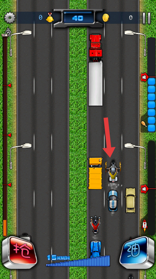 4、合理搭配武器使用时机如优先用武器清除大型卡车障碍、保留武器应对密集车流,同时积累撞车得分,达成关卡得分。