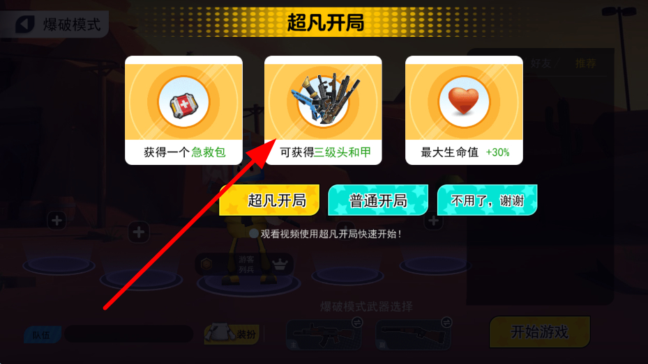 3、开局选择界面,有超凡开局等选项,其中包含获得急救包、三级头和甲等增益,可根据需求选择,为战斗开局创造有利条件。