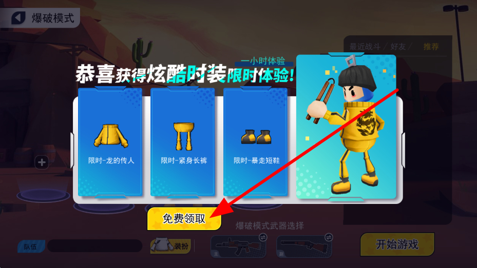 1、开局游戏界面中,遇到领取炫酷时装的提示时,点击免费领取,即可获取限时体验的时装,为角色换上新装扮,让角色更具特色。