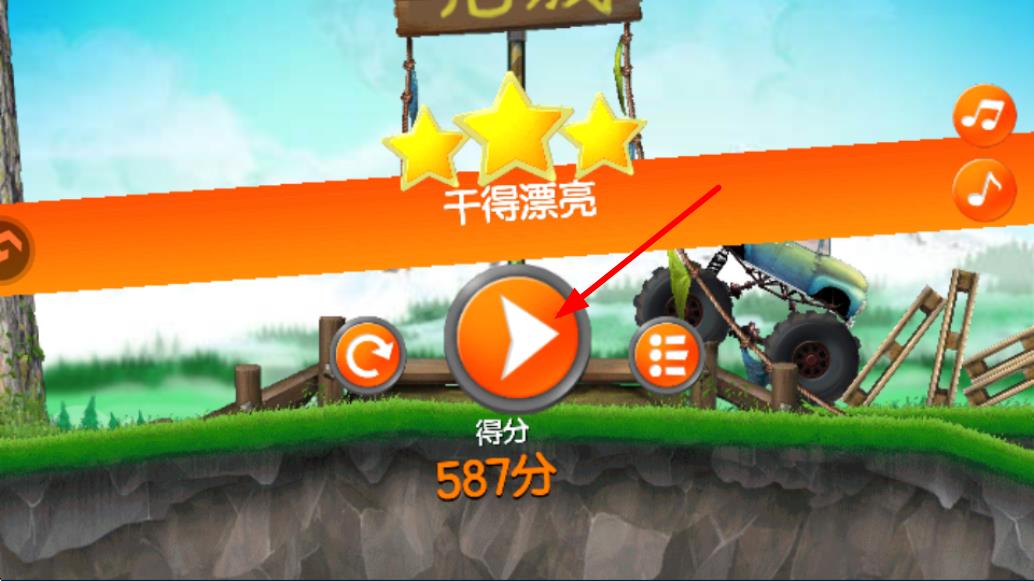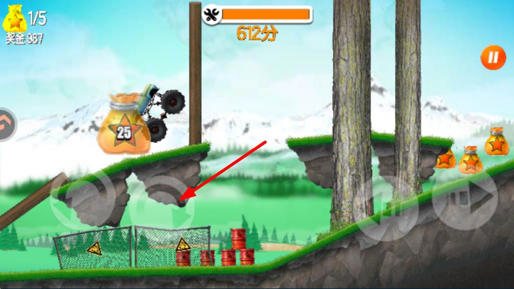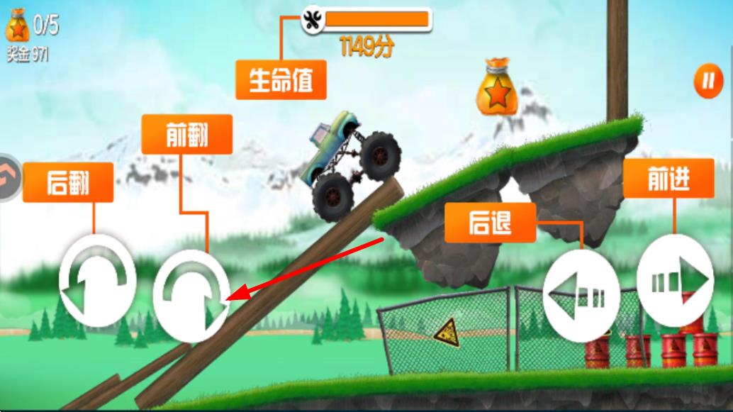 1、点击前翻按键,可控制卡车进行前翻操作,地形调整车身姿态,避免翻车可获取额外分数。