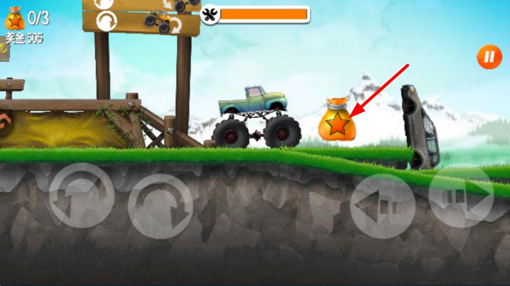 2、收集箭头指向的金币袋,可获取金币资源,升级卡车性能、解锁卡车等,助力游戏进程。