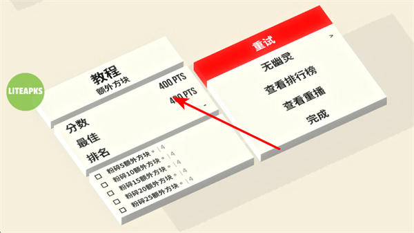 3、查看游戏成就,在结算界面中,查看粉碎方块的分数和教程完成情况,了解游戏进度。
