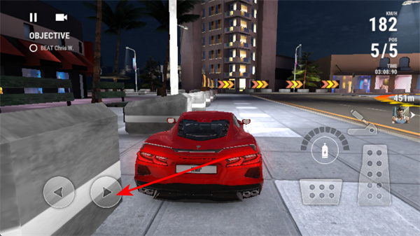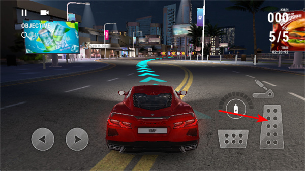 1、进入游戏后,使用油门踏板控制车速,驾驶赛车的关键操作,控制后可在城市道路中加速行驶,完成任务目标。