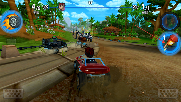 1、在比赛场上,可以利用各种手段超越前方车辆,利用右侧道具攻击车辆进行超车。