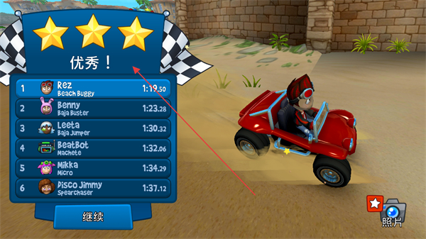 2、根据玩家车辆越过终点线的用时进行排名,获取游戏星级评分。