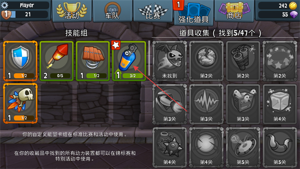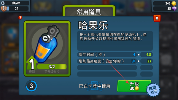 4、点击进道具信息页面,通过消耗卡片和金币来升级道具的属性值。