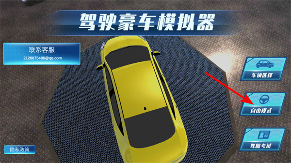 1、进入后点击界面右侧的自由模式按钮,可进入豪车驾驶的自由体验场景,开启驾驶玩法。