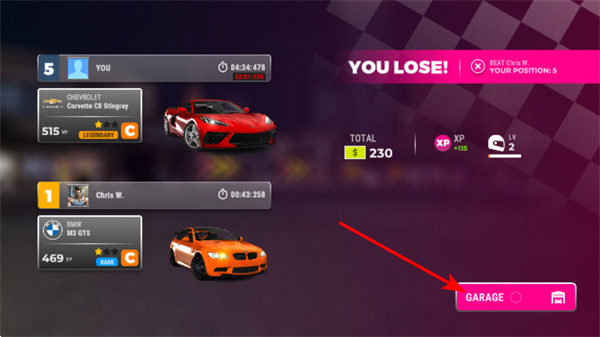 1、比赛失利后点击GARAGE按钮,这是调整赛车配置的关键操作,点击后可进入车库界面,进行升级更换。