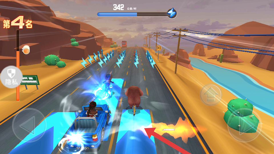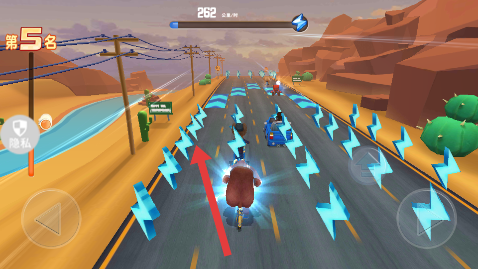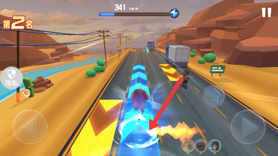 2、行驶过程中,驶入蓝色闪电区域,获取加速效果,提升行驶速度,拉开与其他选手的距离。