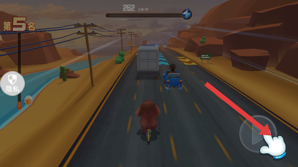 1、比赛中,点击右侧方向按键,控制角色在赛道上转向,避开障碍物,超越前方车辆,提升排名。