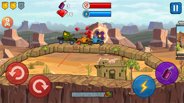 3、操控车辆在石桥上行驶,攻击其他车辆并收集物品,借助道具推进当前关卡进程。