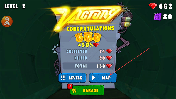 4、通关后进入VICTORY界面,获取通关奖励后点击MAP按钮进入后续关卡。