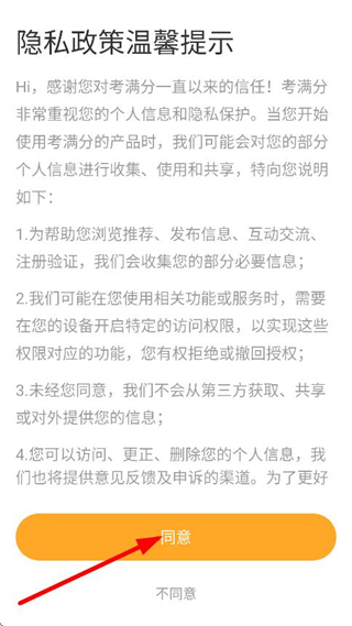 1、在隐私政策温馨提示弹窗中,点击同意,进入考满分登录页面。