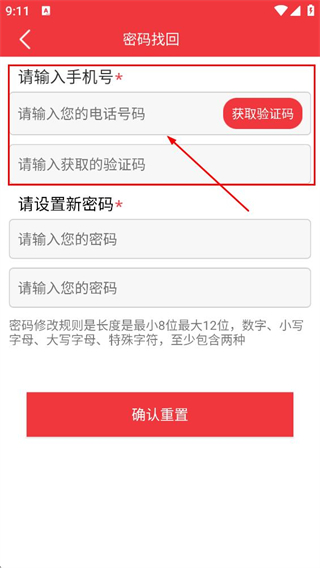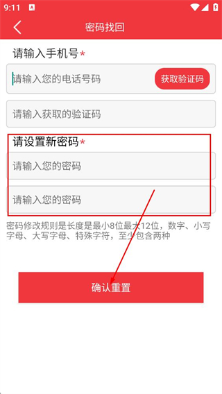 3、填写收到的验证码,填写密码并确认,点击确认重置,完成密码重置。