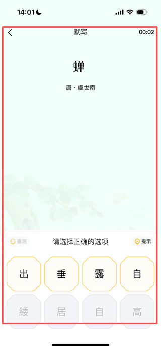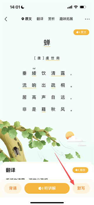 4、在默写页面,可通过录音选择正确字词完成蝉的默写练习。