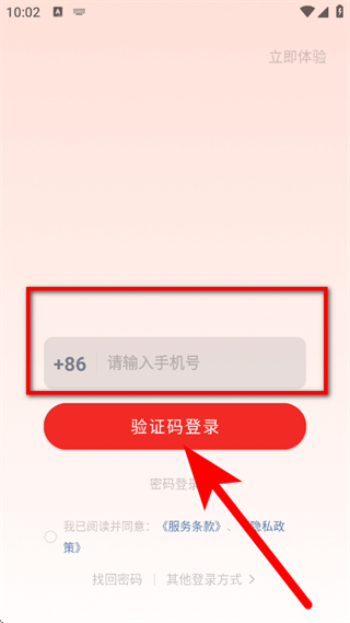 3、在登录界面,输入手机号,点击验证码登录。