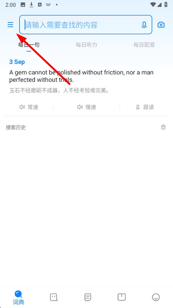 1、打开欧路词典app在首页点击左上角的三条横线图标打开侧边栏菜单。
