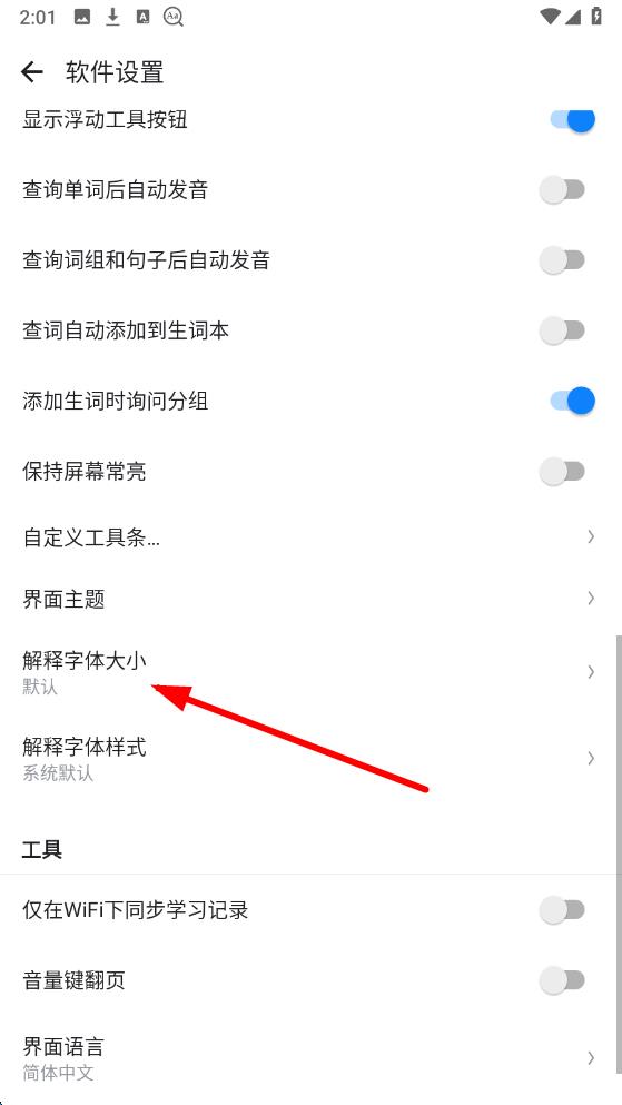 3、在软件设置界面中下滑找到解释字体大小选项,点击后根据个人需求选择合适的字体大小,即可完成欧路词典字体大小的设置。